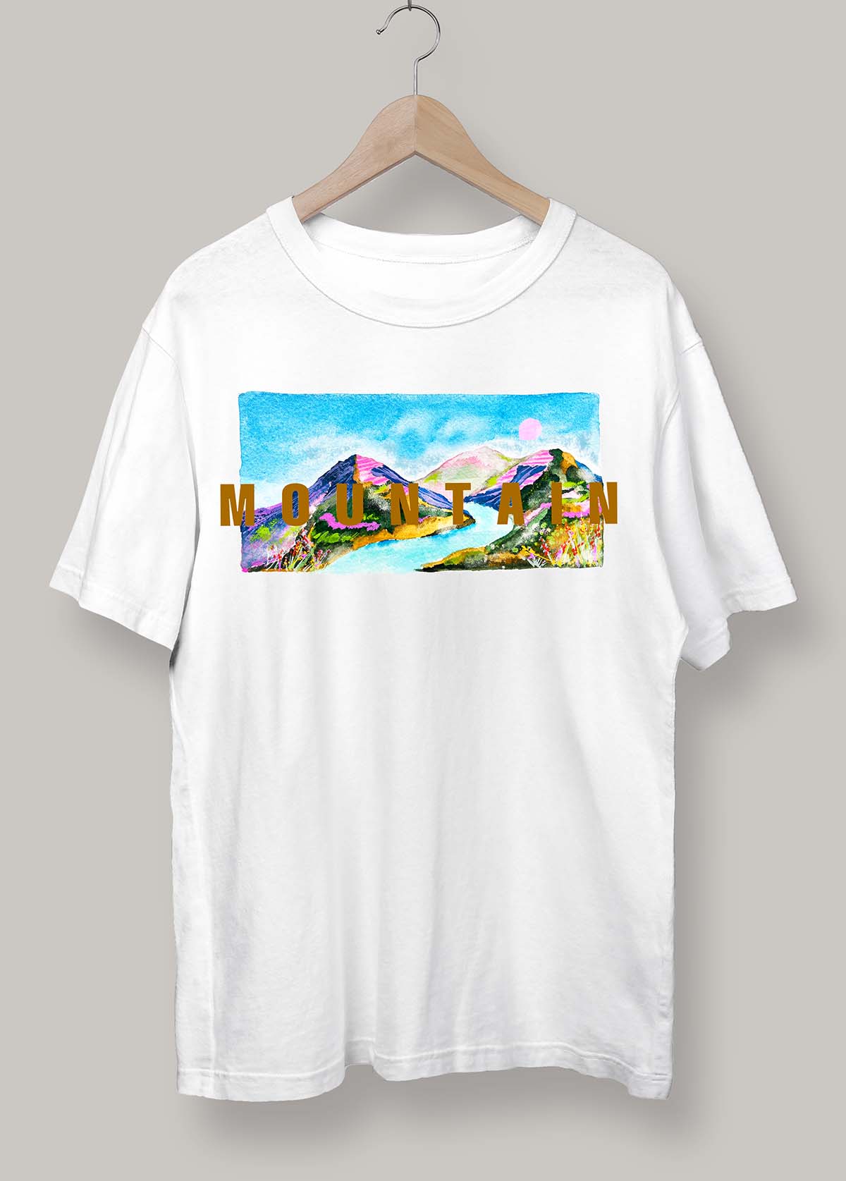 This is a 100% cotton t-shirt with a hand painted illustration of Mountain.